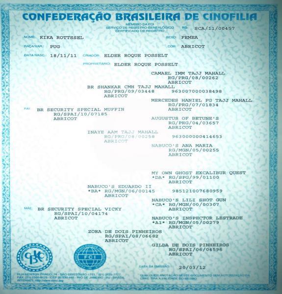 Home / Nossas Raças / Pug / Kika RottsselPedigree Kika Rottssel SCA/11/00457 18/11/2011 - BR Security Special Muffin Br Shankar Cmh Tajj Mahall Camael Imm Tajj Mahall Mercedes Haniel FG Tajj Mahall Inaye Aam Tajj Mahall Augustus Of Betune´s Nabuco´s Ana Maria Br Security Special Vicky (BA) Nabuco's Eduardo II (DA) My Own Ghost Excalibur Quest (CA) Nabuco's Lili Shot Gun Zora De Dois Pinheiros (A1) Nabuco's Inspetor Lestrade Gilda De Dois Pinheiros Fotos Documentos ou Certificados