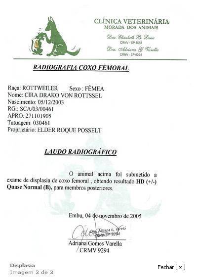 Home / Nossas Raças / Rottweiller / Cira Drako Von RottsselPedigree Cira Drako Von Rottssel HD+/- [?] ED0 [?] CBKC RG/SCA/03/00461 Títulos: Campeã, Grande Campeã, Campeã Panamericana, Grande Campeã Panamericana 05/12/2003 - Drako Security Torro vom Obergrombacher Schloss HD- [?] ED0 [?] Irk vom Obergrombacher Schloss Mona vom Obergrombacher Schloss HD- [?] Darling Dog's Jessy Efendi von der Sudpfalz Darling Dog's rebeca Eyka Cookie von Germanisch HD- [?] Fantasa Tangerine Man Cuidado Street Life of Schleswig (A6) Fantasa Scarlet O´Hara Frestani´s Luna (A6) Varus Von Wolfsberg Evi Von Der Mauth Fotos Exames Documentos ou Certificados